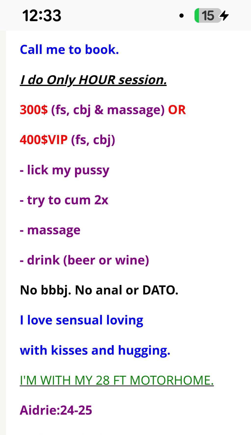 My incall is 300H or 400Hvip ( I do only Hour). VIP includes drink, massage, daty and msog).